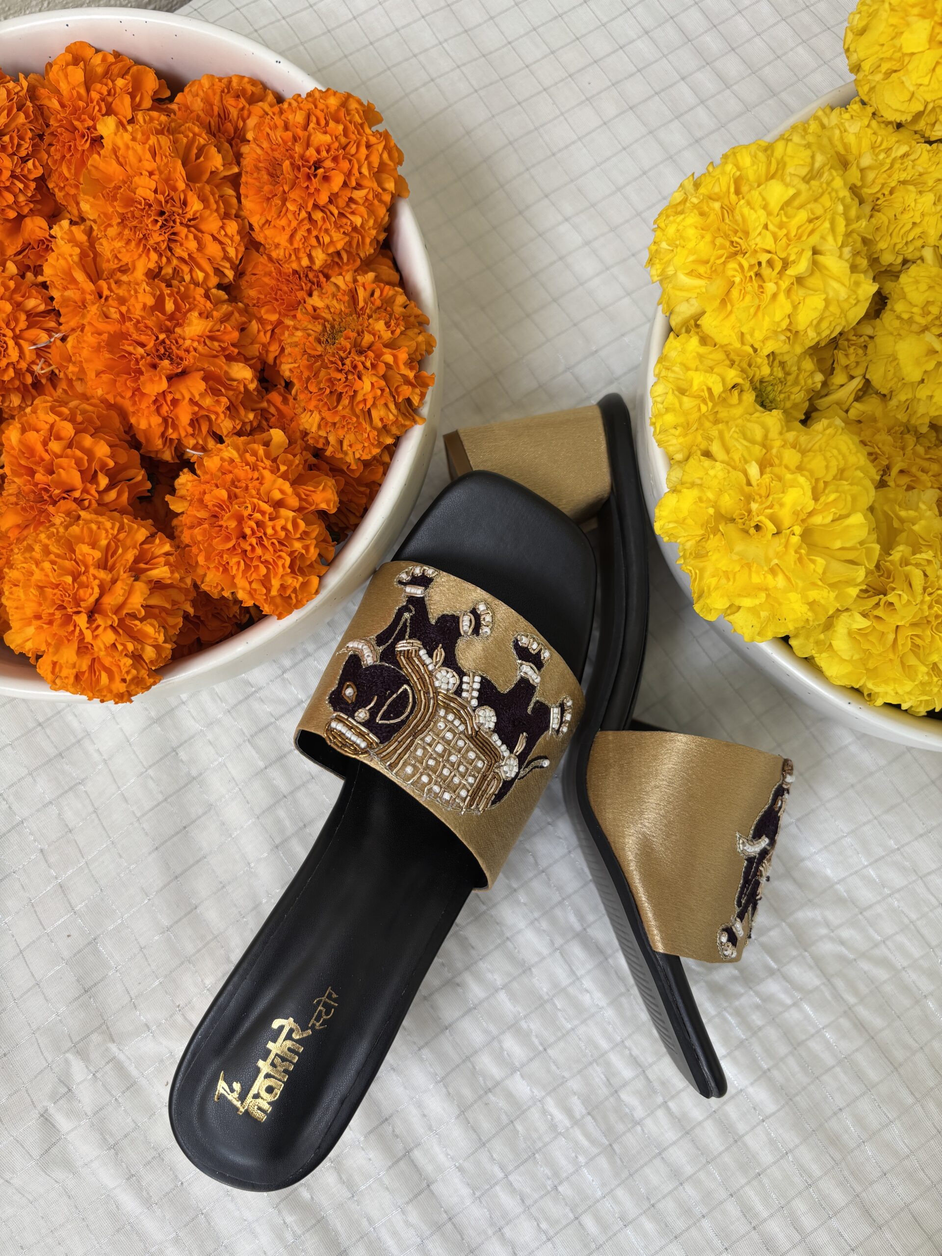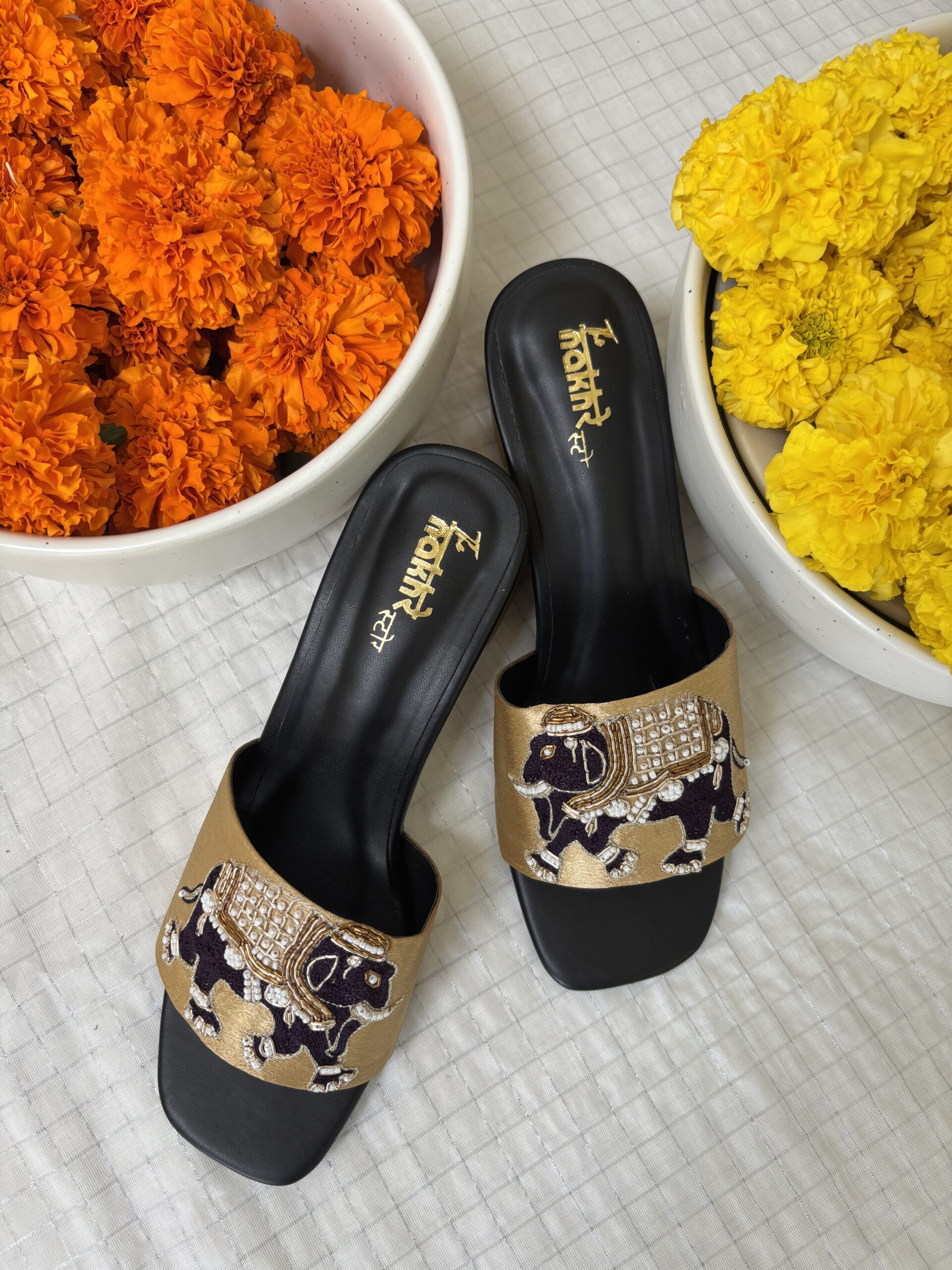 Step into elegance with Gajraj , a celebration of traditional artistry and modern design. These handcrafted heels feature a striking elephant (“Gajraj”) motif, symbolizing royalty and strength, intricately embroidered with fine thread work and adorned with delicate Zardozi work. The premium mustard-gold satin upper exudes luxury, beautifully complemented by traditional beadwork that adds a regal ethnic charm. Designed for both style and comfort, Gajraj features a 2.5-inch satin-lined block heel for a graceful lift and a cushioned black footbed with subtle arch support for all-day ease.