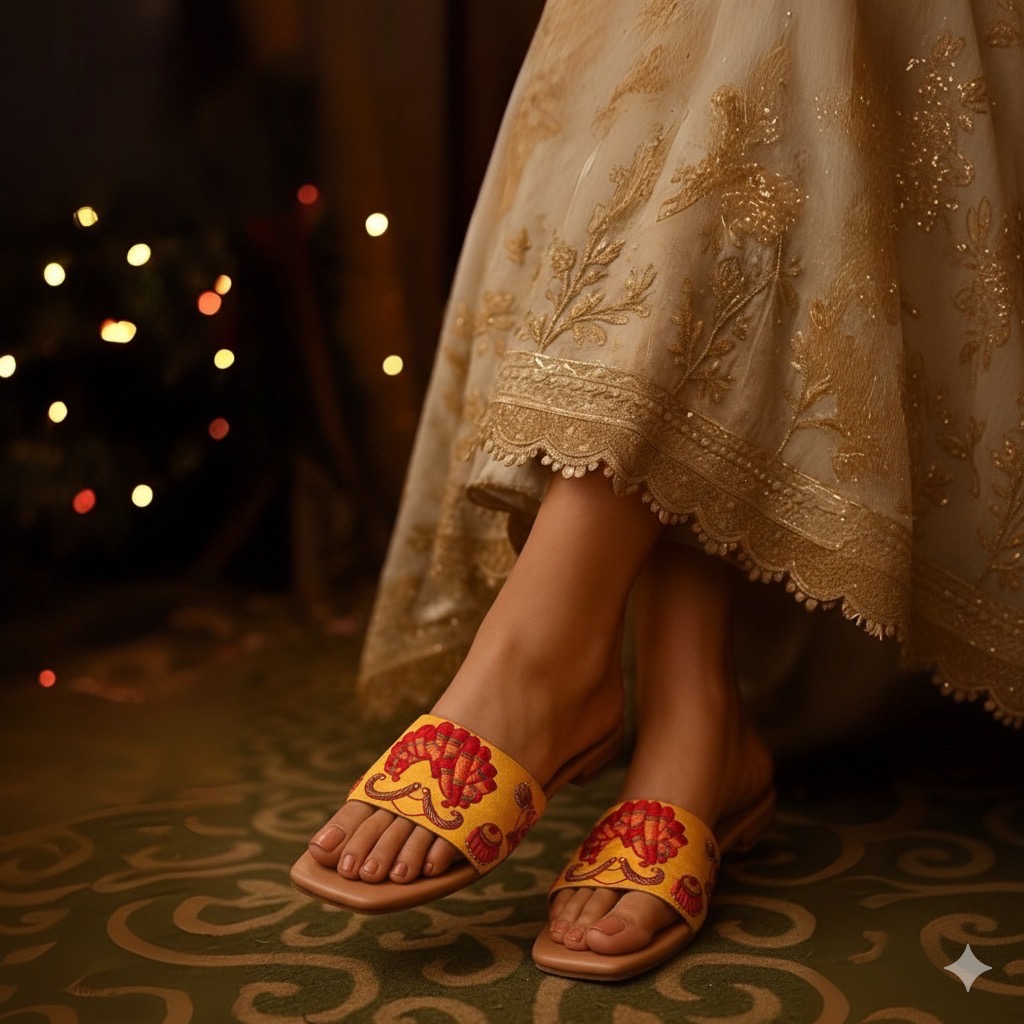 Rooted in the rich heritage of Rajasthan, the Khamma Ghani sliders feature intricate hand embroidery that reflects regal and traditional motifs. These open-toe sliders designed for comfort and elegance, perfect for casual outings or festive occasions.