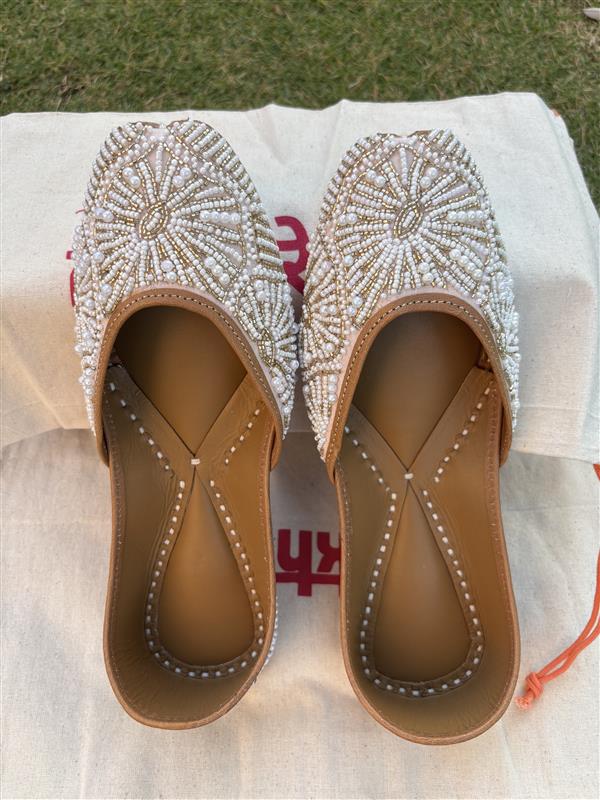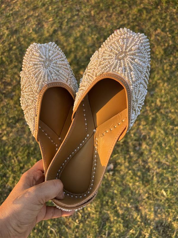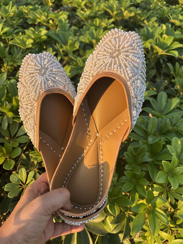 A graceful blend of old-world charm and fine craftsmanship, these pearl-embellished juttis are designed to stand out in subtle sophistication. The intricate handwork creates a textured, heirloom-inspired look that feels refined yet wearable. Whether paired with soft pastels, chikankari, or classic ethnic silhouettes, this pair adds a quiet statement of elegance and ensures you leave a lasting impression without trying too hard.