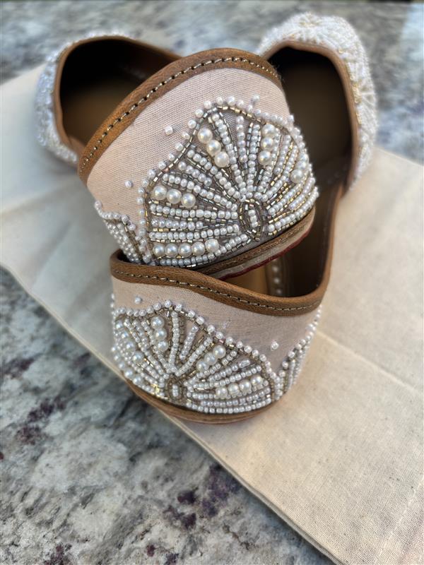 Upper: Handcrafted pearl detailing with fine embroidery on a cotton fabric base