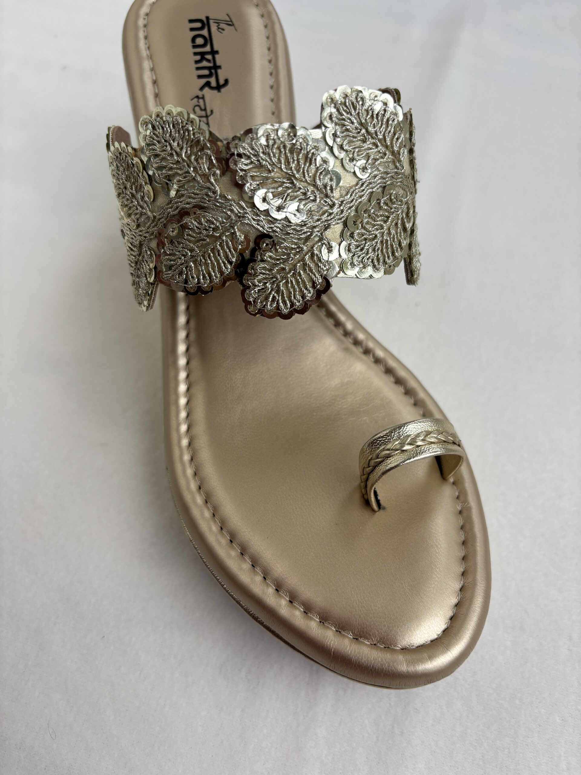 Step into effortless elegance with these gold-toned wedge sandals. Designed to blend comfort with festive charm, these sandals feature intricate metallic thread embroidery on the upper strap and a sleek toe loop for a secure fit. The soft cushioned footbed and stable wedge heel make them perfect for long hours, whether you’re attending celebrations or styling everyday ethnic looks.